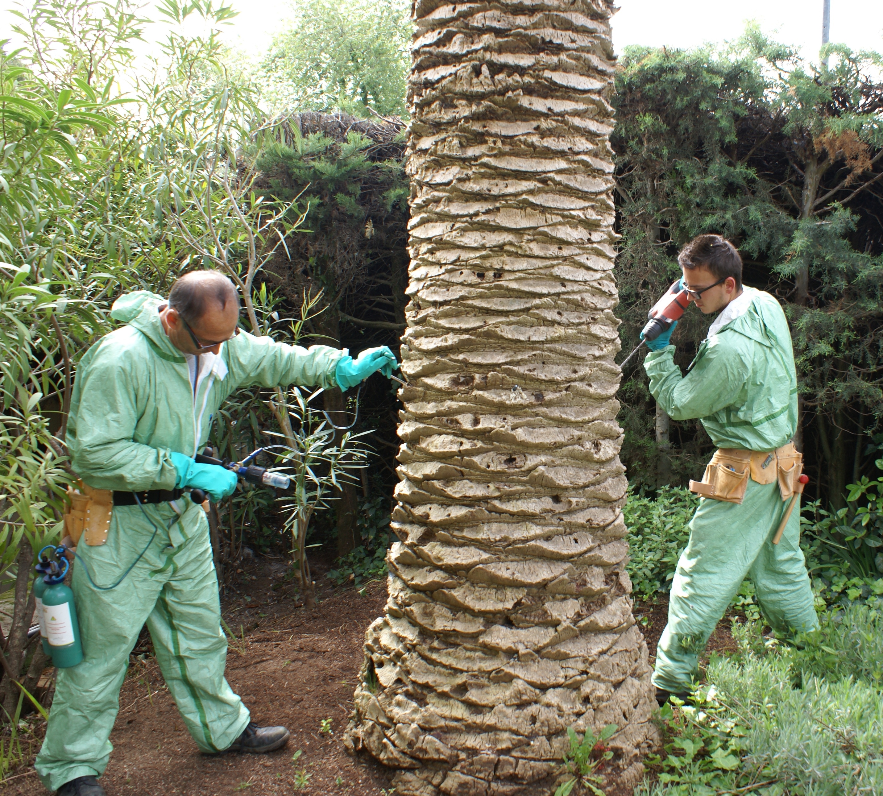 Le traitement pourra être réalisé entre le 1 er mars et le 15 novembre (arrêté ministériel du 30/06/2016) . La période optimale étant cependant le printemps. Il consiste en une seule injection dans le stipe du palmier d’un total de 21 ml d’une solution d’émamectine benzoate à l’aide d’un pistolet applicateur. L’injection s’effectue via 4 trous de 6 mm percés à hauteur d’homme et positionnés de façon hélicoïdale et répartis dans les 4 quadrants du stipe. La profondeur du trou est d’environ 1/3 du diamètre du stipe avec un minimum de 15 cm de profondeur. Pour les petits sujets, l’injection doit s’effectuer au minimum à 50cm de la base de la couronne. Ce traitement est réservé aux palmiers ayant un stipe de 1,50 m de haut au minimum et de 45 cm de diamètre au minimum.